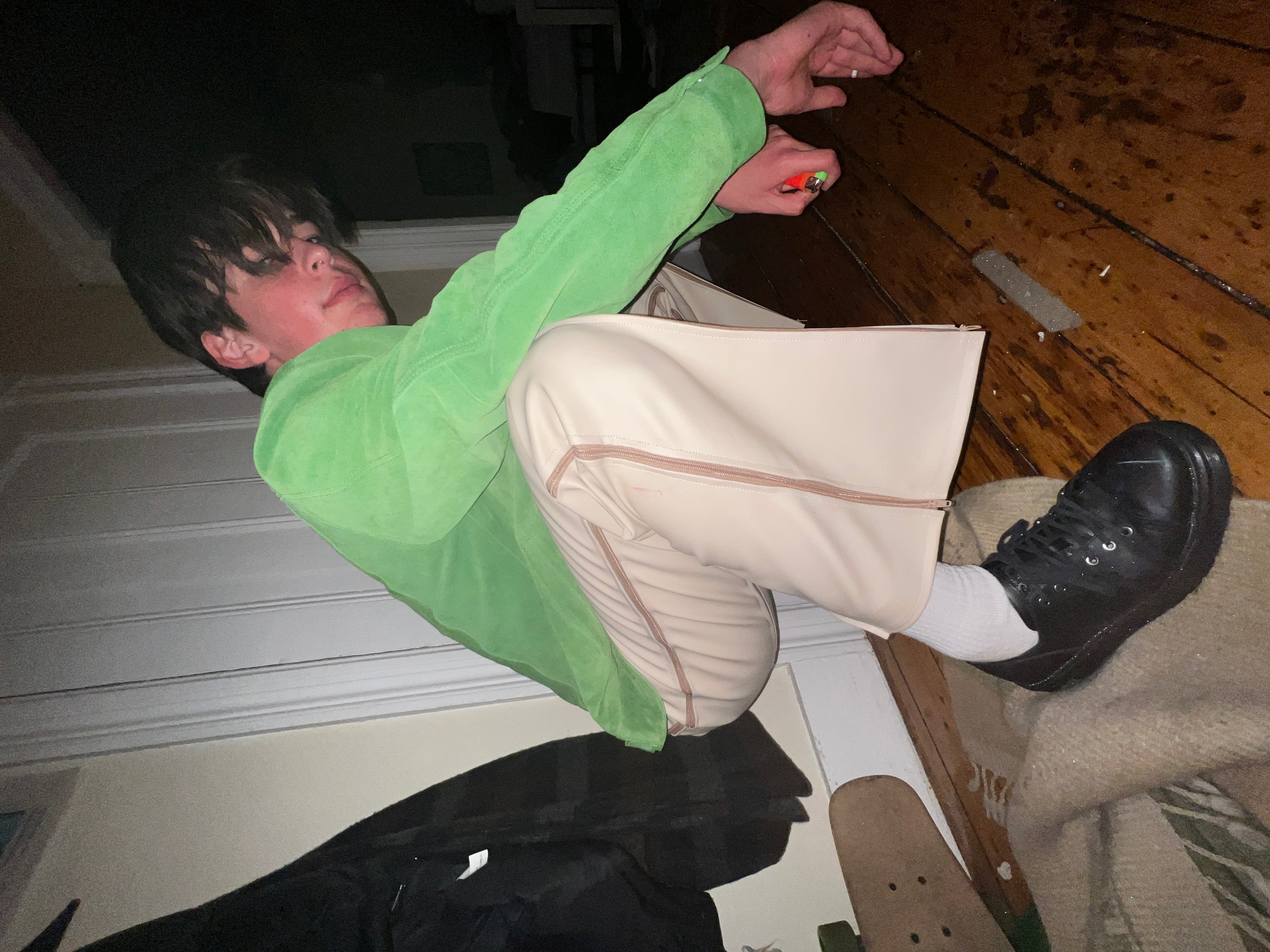 This is an apparel project of my own design, executed and assembled with my own hands. The Zipper Pants [2023] are a pair of paneled leather pants, held together by zippers that stretch the length of the leg. This pair of pants consists of a total of nine zippers; the fly which extends up through the waistband and eight leg-length zippers that unzip from the bottom up.
